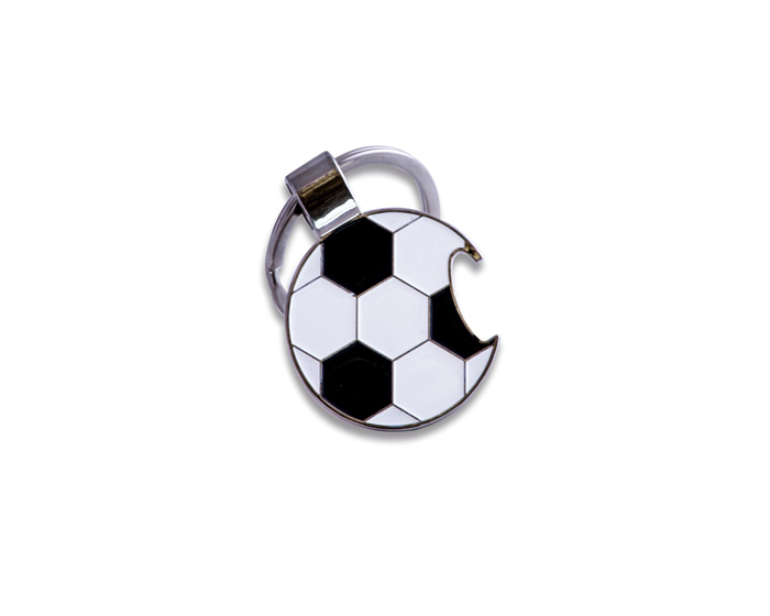 Llavero metálico con esmalte en forma de balón, con arillo reforzado y destapador.